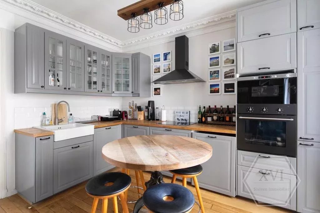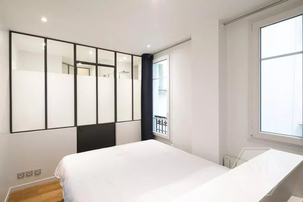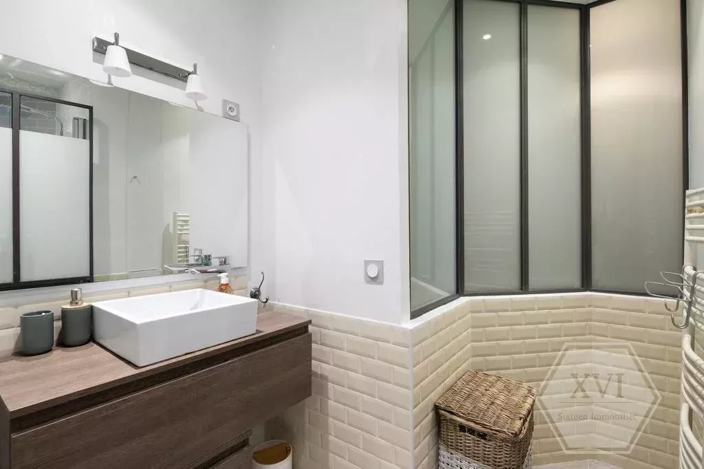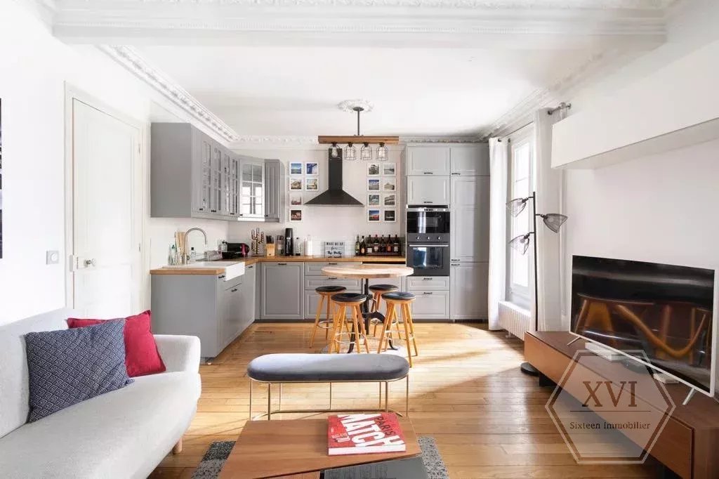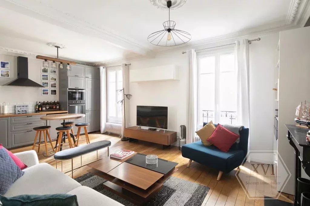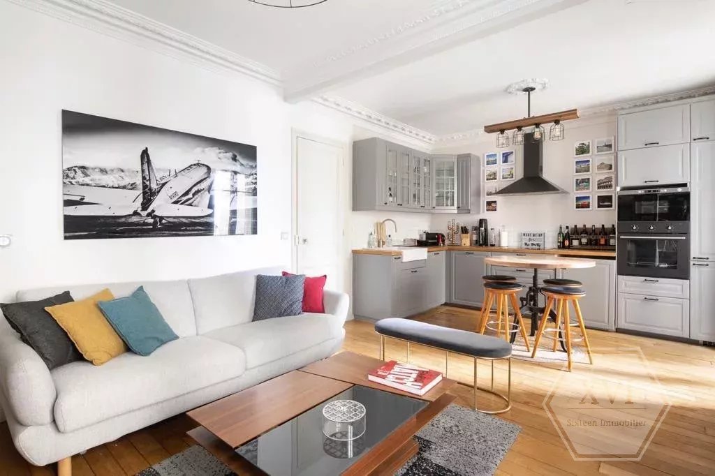 Sur l'avenue de Versailles dans un immeuble ancien, appartement en location meublée entièrement refait à neuf comprenant un beau double séjour avec cuisine ouverte, une chambre avec placards, une jolie salle de bains et un WC séparés.